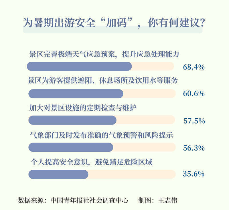 加强暑期出游安全,68.4%的受访者希望景区完善极端天气应急预案,提升应急处理能力,60.6%的受访者期待景区为游客提供遮阳、休息场所及饮用水等服务,57.5%的受访者希望加大对景区设施的定期检查与维护,56.3%的受访者希望气象部门及时发布准确的气象预警和风险提示。